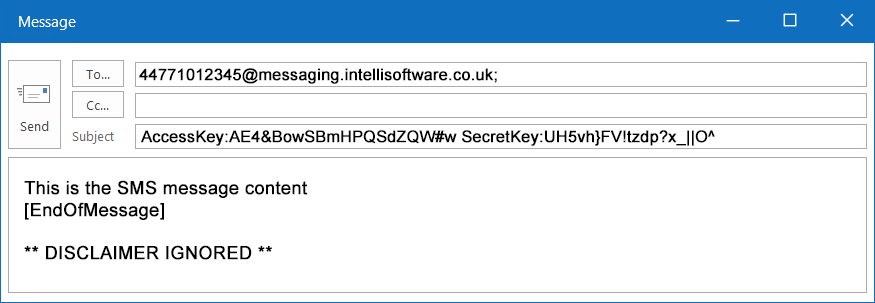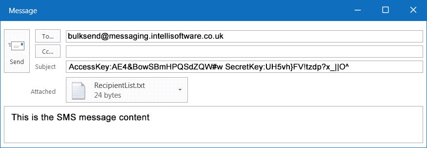 We can configure the gateway to recognise your email 'From' address. This has the advantage that you will not need to insert your username and password in the email. To have these feature setup on your account please send an email to support@intellisoftware.co.uk specifying your username and your email 'From' address.