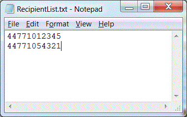 The message recipients are listed in an attachment file (can be any filename). Each recipient must be listed on a new line: